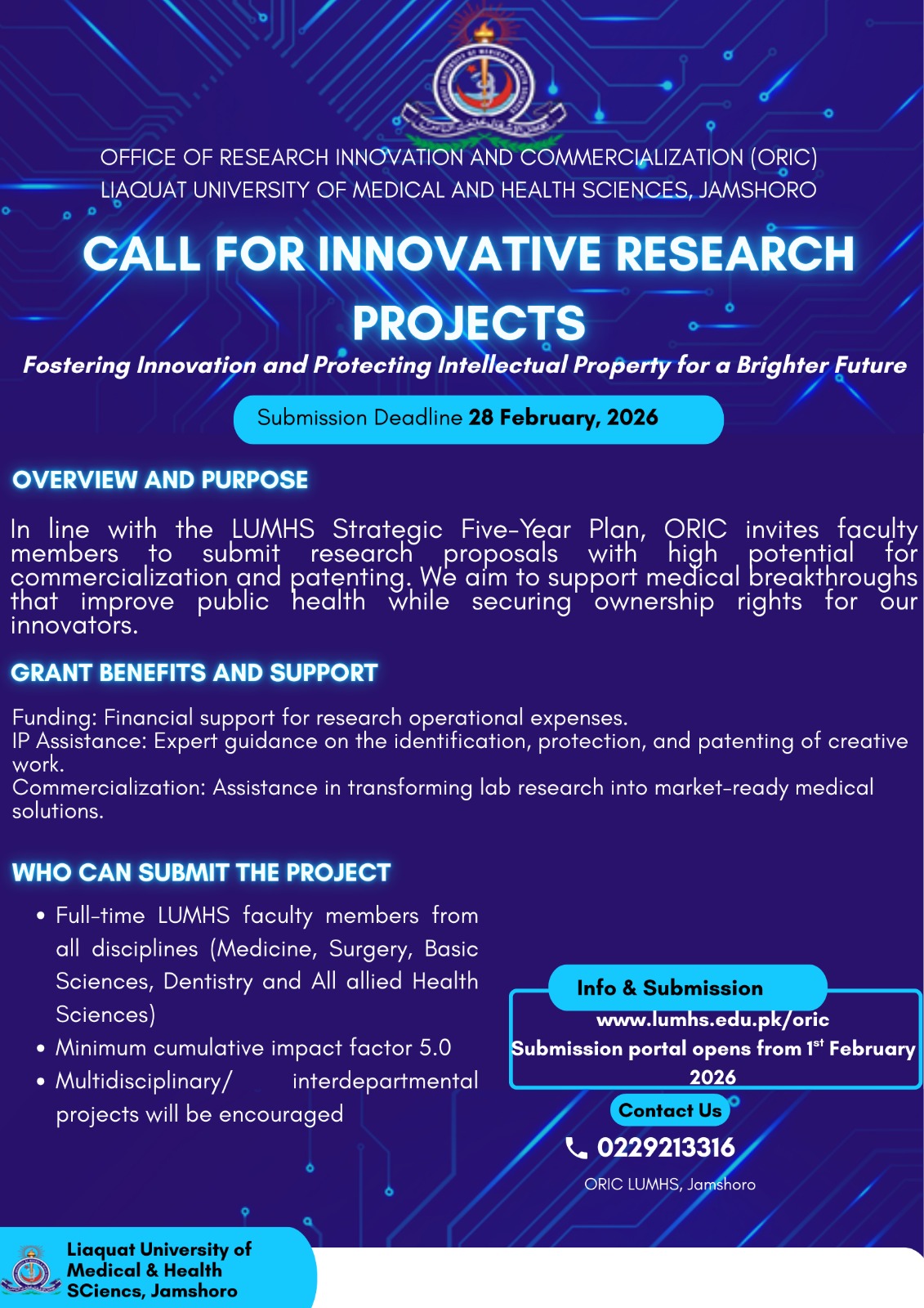 ORIC - LUMHS Jamshoro invites faculty members to submit innovative, high-impact research proposals with commercialization and patenting potential.