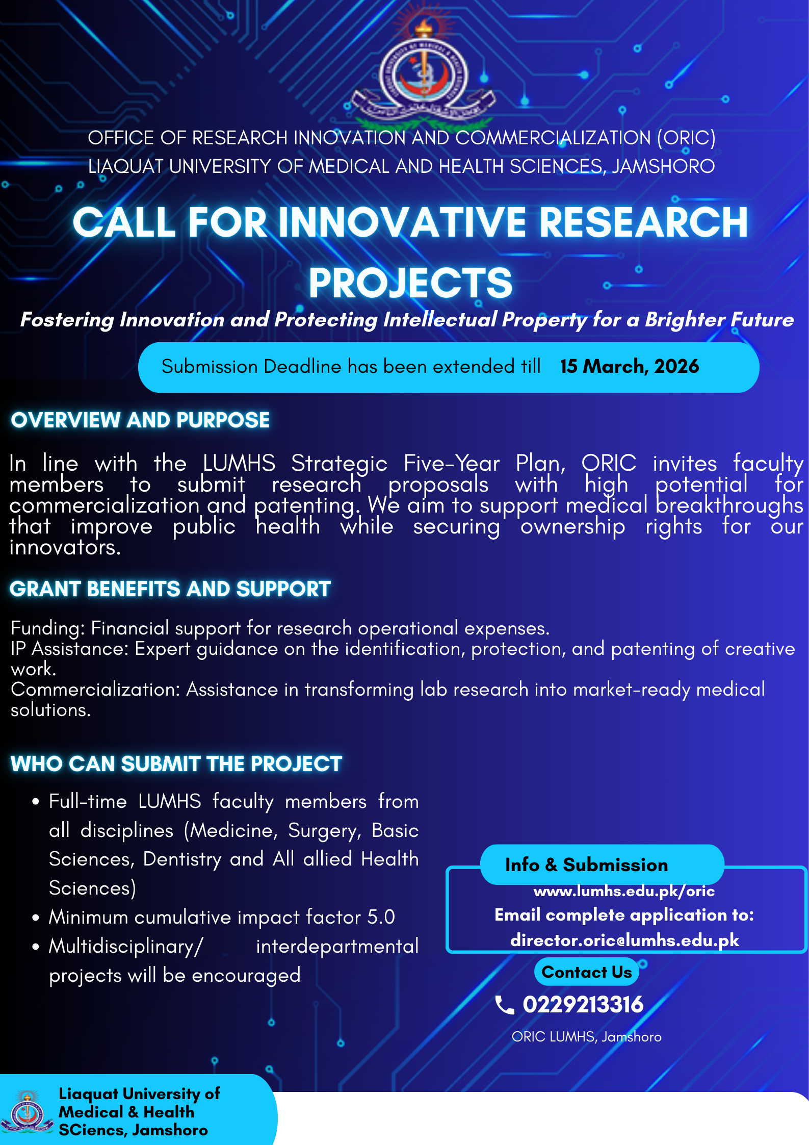 ORIC - LUMHS Jamshoro invites faculty members to submit innovative, high-impact research proposals with commercialization and patenting potential.
