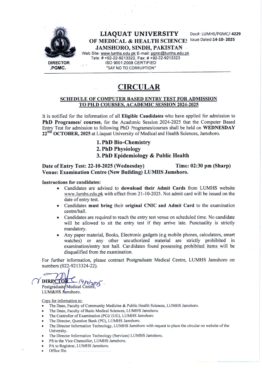All the Postgraduate students of various Postgraduate courses, LUMHS, Jamshoro are hereby directed to clear their outstanding dues latest by 10. 05. 2025