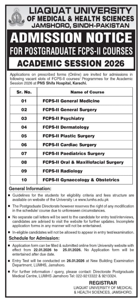 Applications on prescribed forms (Online) are invited for admissions in following postgraduate Programmes for the Academic Session 2026 at Liaquat University of Medical & Health Sciences, Jamshoro.