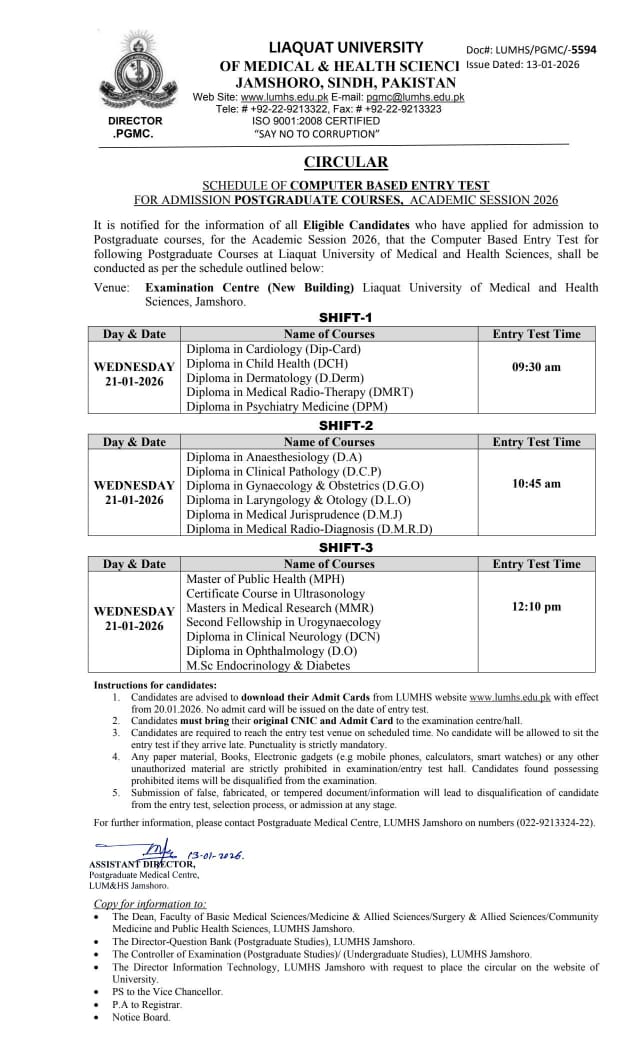 For further information / query, please contact: Directorate Postgraduate Medical Centre, LUMHS Jamshoro Tel: 022-9213322 & 9213324.