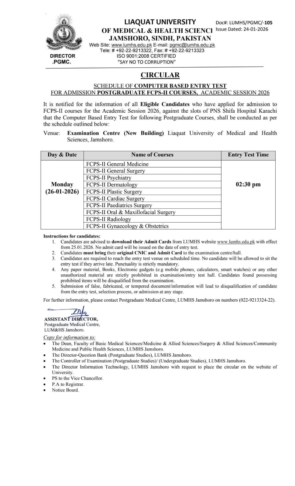 2. For further information / query, please contact: Directorate Postgraduate Medical Centre, LUMHS Jamshoro Tel: 022-9213322 & 9213324.